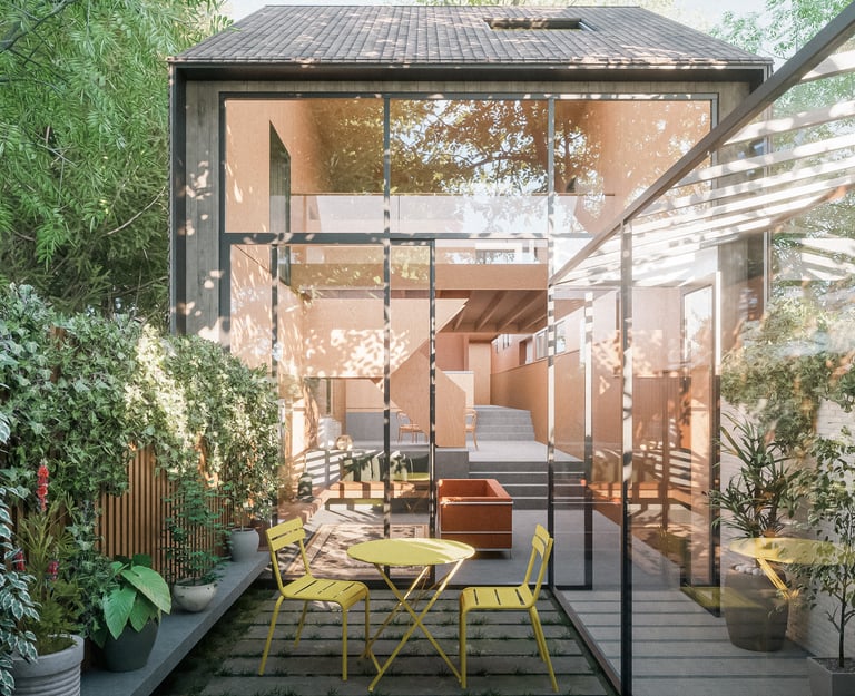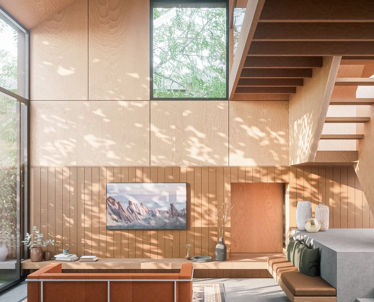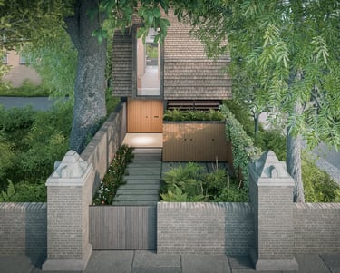 The entrance to the house is via a walled garden, shaded by existing Lime and Horse Chestnut trees. The cantilevered first floor creates a sheltered entrance beneath which a wide timber-clad high security entrance door provides level access into a generous hallway. Cycle storage, bin storage and meters are located at entrance.