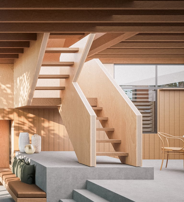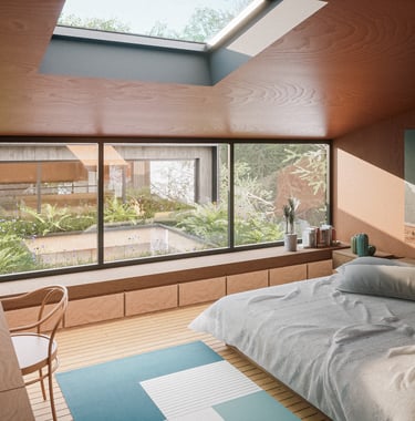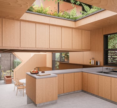 Glimpses of the trees outside, filtered sunlight with shadowy silhouettes of vegetation through translucent screens, timber lining of interiors and a blurring of internal and external planting will all help to reinforce this effect.