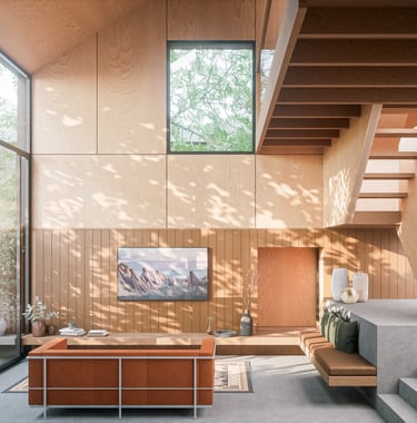 At the rear of the lower living floor a second stair provides access to a generous mezzanine with views over the double height living area and the central courtyard garden.