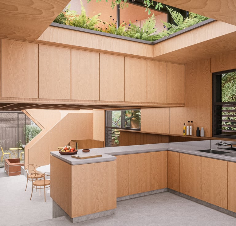 The house, which occupies a part of London that was once at the heart of The Great North Wood will sit on a suspended steel deck supported on mini-piles. All surface rainwater will be redirected back under the house to minimise impact on root habitat.